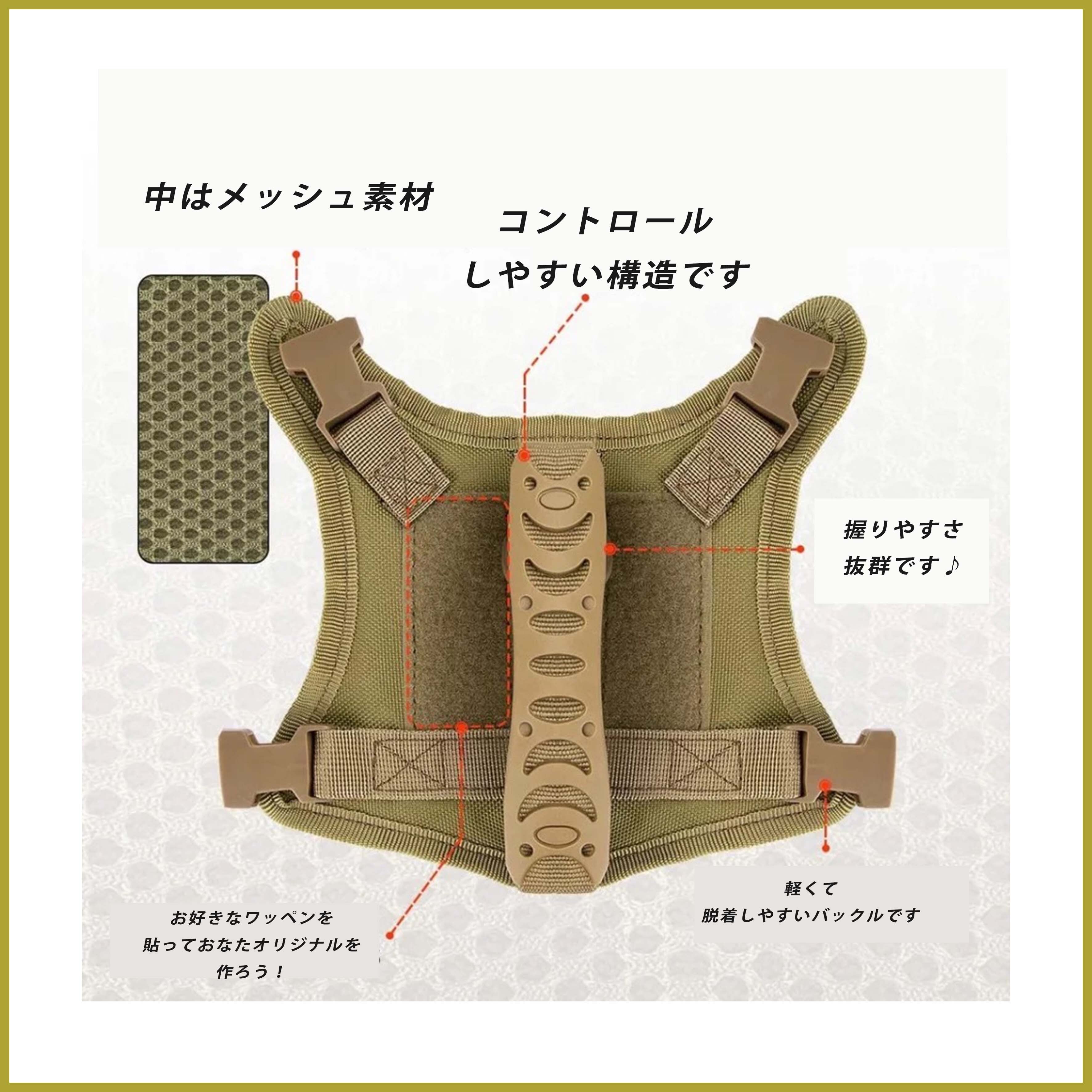 小型犬・猫ちゃんにもおすすめのアーミースタイルハーネスです。