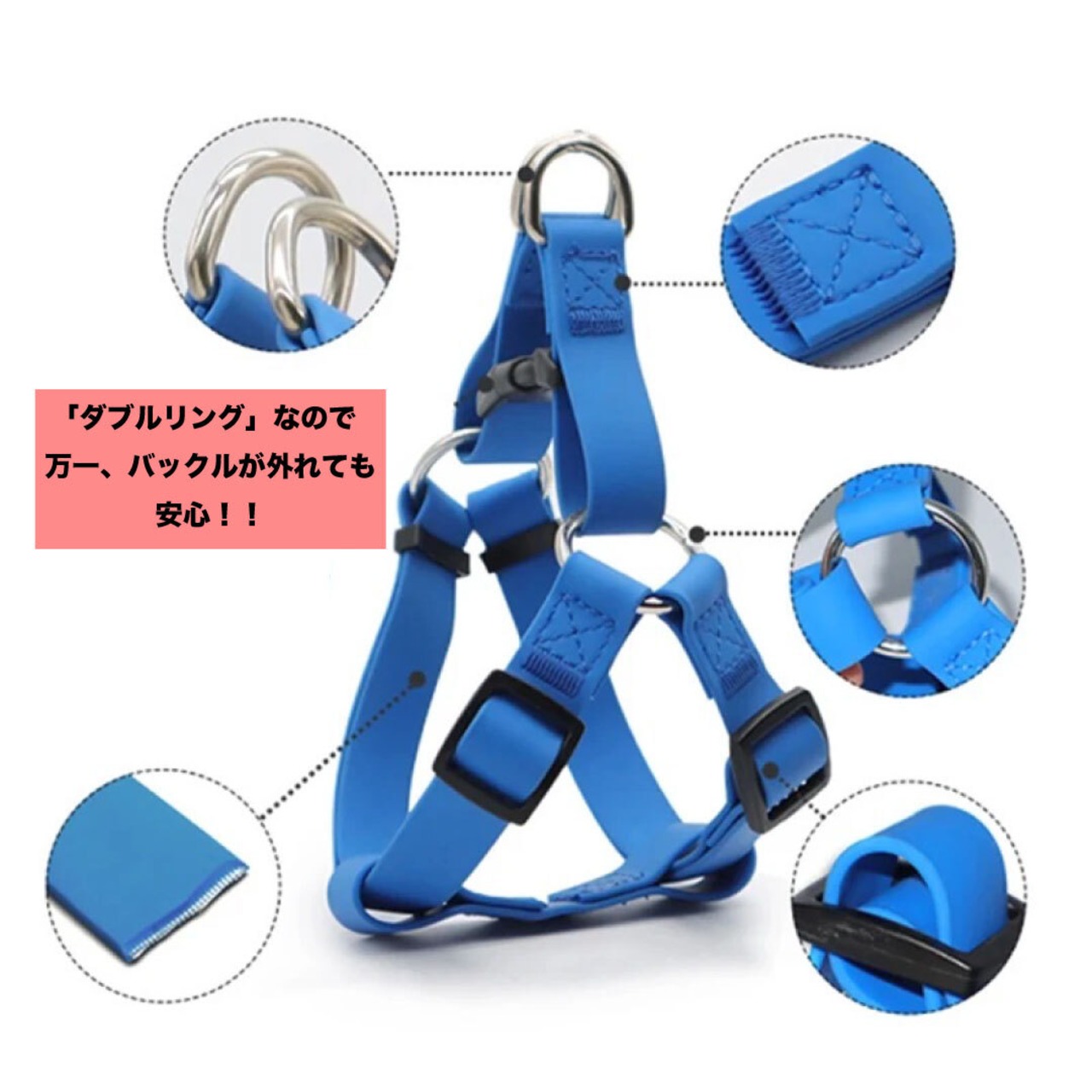 ダブルリングで万一、バックルが外れた時もDリングと繋がっているため水遊びの時など激しく遊ぶ時も安心です。